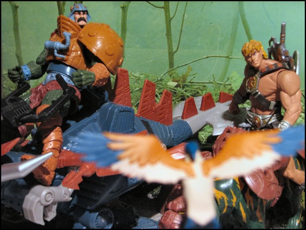 ?Man-at-Arms, wir müssen zu Buzz Off und Man-E-Faces! Es steht schlecht um sie! Los, alter Kater!?, trieb He-Man Battle Cat und Duncan an. Auch Duncan gab dem Dragon Walker die Sporen. Orko sollte sich zum Palast beamen, um von dort aus einen Wind Raider zu Hilfe zu holen. Noch bevor das Läuten seiner Glöckchen im Vine Jungle zu hören war, waren He-Man und Man-at-Arms nicht mehr zu sehen?