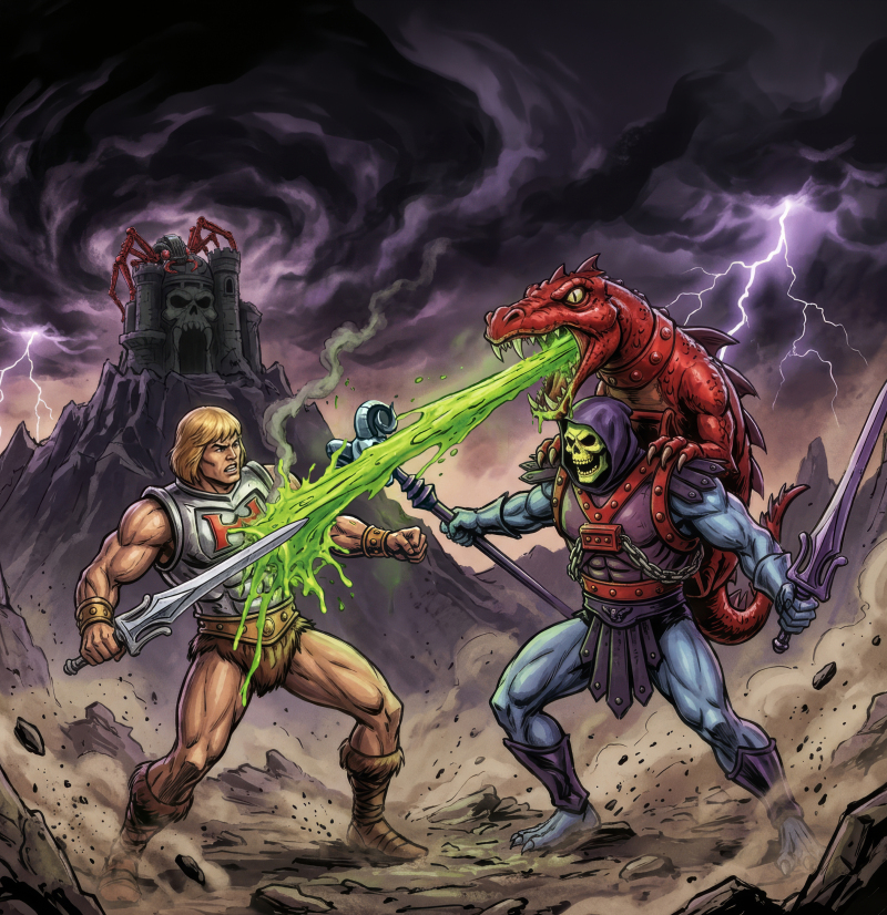 Ich dachte auch immer der Drache sprüht nur Schlafnebel. Aber am Ende der Folge besprüht der Drache He-Mans Rüstung mit Gift, nur ohne Wirkung weil es die neue Zauberrüstung ist, bzw. das Gift prallt daran ab (sagt Skeletor . )