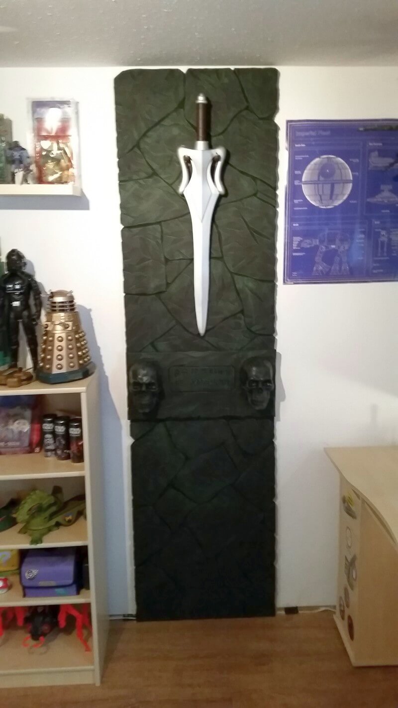 Das Schwert gefällt mir sehr gut und auch die hintere Wand ist massig gestaltet! Aus welchem Material ist das Schwert?