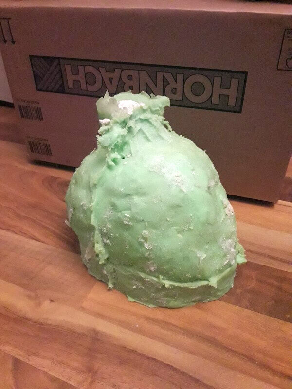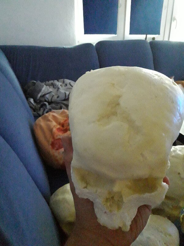 Die Schädel sind mit 2K Zargenschnellschaum geschäumt. Eine Doppelkartusche für je einen Schädel. Man hätte jetzt auch teuren 2K PU Schaum nehmen können und sicherlich noch schönere Ergebnisse erzielen können, aber der Bauschaum ist wesentlich Günstiger und wird auch schneller fest. So kann man quasi Instant Schädel schäumen.