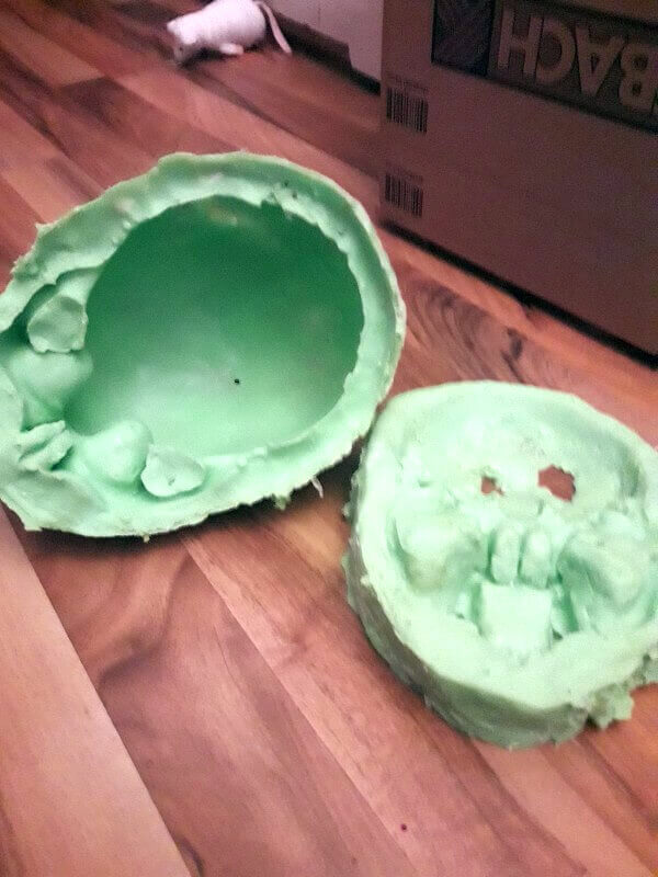 Hier habe ich einen Schädel aus der Markus Meyer Collection genommen und mit Hilfe des 2k Gießsilikons von Trollfactory eine zweitielige Form erstellst. Die Löcher im Boden der Form deinem als Luftkanäle.