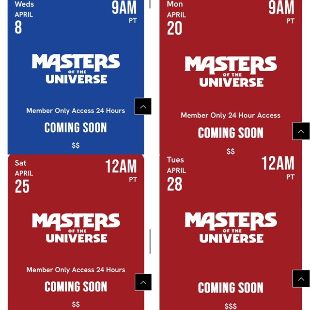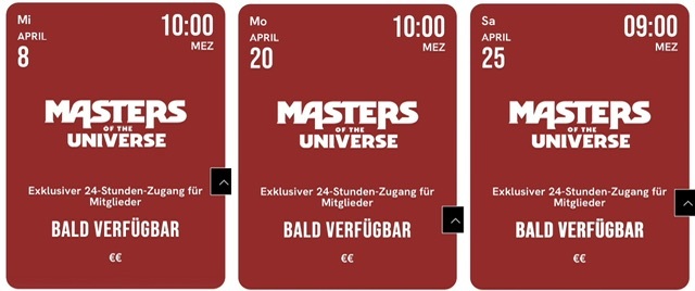 Im April kommen nach dem MotU Chronicles King Grayskull (?) noch drei weitere MotU-Verkäufe. Zwei davon sind um 12 am US-Zeit, das wäre Mitternacht dort und somit 9:00 Uhr vormittags bei uns. Und der letzte am 28. April hat sogar drei Dollarzeichen.