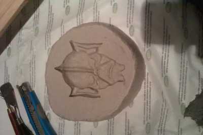 Hier aus Plastilin geformt der Kopf für das Hordeszeichenn auf dem Brustkorb.