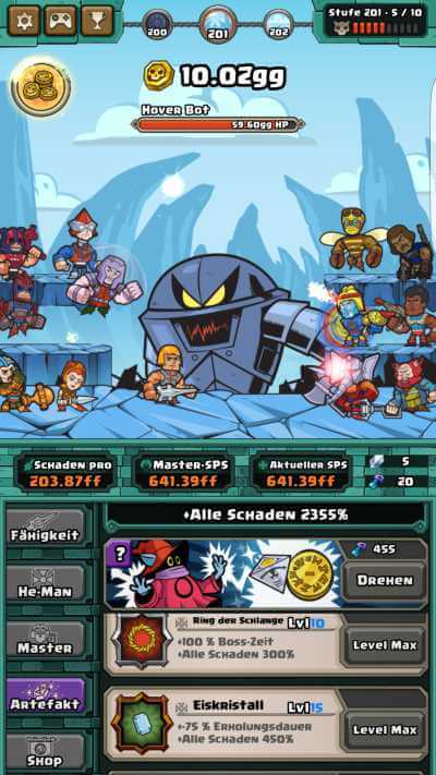 Weiterhin solltest du ALLE Artefakte aufleveln, jedes hat seinen Sinn und Zweck und den schaden erhöhst du zusätzlich zu diesem Sinn oder Zweck. Von daher Schlüssel einsetzen wo geht (hierzu gleich mehr). Ich hatte Glück und habe von Anfang an den Schlangenring als Artefakt. Der erhöht die Zeit, den Boss zu besiegen. Hab den auf Max-Level und hab somit 1Minute Zeit, einen Boss platt zu machen und erhöhe den Gesamtschaden noch um einige 100%. Es lohnt sich wirklich, die Schlüssel nicht zu horten, sondern einzusetzen.