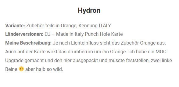 Übrigens, was mir auffiel: Der bei Deinem MOC Upgrade ausgepackte Hydron hat zwei rechte Beine