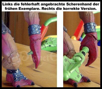 An dieser Stelle sei aber noch auf das wohl größte Manko der Statue hingewiesen: Bei einem Teil der anfänglich produzierten Exemplare wurde die kleine Scherenhand leicht verdreht angeklebt! Hierdurch wiederum passte die Keule nicht mehr korrekt in die Öffnung. Dies wurde zum Glück wenig später korrigiert, und allgemein hatten die meisten "fehlerhaften" Exemplare ihren Weg in die Vereinigten Staaten gefunden. Das Problem ist auch verhältnismässig leicht zu beheben, indem die Klebung durch heißes Wasser und/oder einen Fön gelocktert wird, bis sich die Scherenhand löst. Anschliessend kann sie einfach umgesteckt werden.