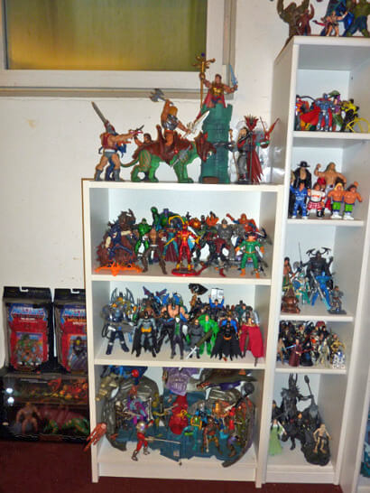 Was macht Ihr beruflich? Falls Ihr noch beide berufstätig seid, immerhin will eine fünfköpfige Familie gut versorgt sein und das beansprucht doch viel Zeit. HordeGirl: Ja, ich arbeite als selbständig als freie Journalistin für diverse Zeitungen. Hat den Vorteil, dass ich meistens von zu Hause aus arbeiten kann, aber auch den Nachteil, dass ich von zu Hause aus arbeiten muss, d.h. die Kids lassen mich selten ungestört arbeiten. Das führt dann dazu, dass ich zum Teil spät abends arbeite oder morgens in der früh um 6 aufstehe, um bis 7 noch zu schreiben. Natürlich musste ich mein Arbeitspensum auch runterfahren, Vollzeit z.B. geht einfach nicht mehr. Ich bin meist ziemlich gut eingespannt und kann oft nicht alles annehmen, was ich machen soll. Reilly: Ich bin Mediengestalter und arbeite als Seniorlayouter in einer großen Münchner Werbeagentur. Dort erstelle ich den Seitenaufbau für Printflyer, kümmere mich um die Layouter meines Teams sowie Azubis, Praktikanten und Freelancer, übernehme die Jobverteilung und mache noch dieses und jenes darüber hinaus. Eure Freunde und Bekannte wissen ja sicher, auf welche Weise Ihr Euch kennengelernt habt. Wie stehen sie zu diesem nicht alltäglichen Hobby? Gibt es unter ihnen auch ähnliche Fans bzw. habt Ihr auch privat regen Kontakt zu PE Usern? Die Redaktionsmitglieder mal ausgeschlossen. Reilly: Für die meisten Leute in unserem Freundes- und Bekanntenkreis ist es kein Thema, über das viel geredet wird. Die sehen das wie wir selbst auch als normale Freizeitbeschäftigung, so wie jeder irgendein Steckenpferd oder Hobby hat. Interessant ist es eher, wenn Leute in den Keller kommen und dort den Toyroom erblicken, oder an meinem Arbeitsplatz die drei dort aufgestellten Figuren sehen. Besonders die Männer sind dann doch beeindruckt und staunen nicht schlecht. Leute aus "unserer" Generation erkennen häufig auch bestimmte Sachen, fragen nach und haben dann ein kleines nostalgisches Leuchten in den Augen - im übrigen auch die Frauen! Neben der sehr guten Freundschaft mit Manuel habe ich einige gute Kontakte mit anderen Fans weltweit. Ausgiebige private Fanfreundschaften pflegen wir aber nicht wirklich - was vor allem an der räumlichen Distanz und der Tatsache liegt, dass wir nur unter großem Aufwand ohne die Kinder raus zu einem Fantreffen fahren können. Die Familie geht da nunmal vor. ![]() Abbildung : Auch Vitrinen dürfen nicht fehlen Werden Eure älteren Kids schon entsprechend versorgt mit MotU Figuren, immerhin hat der Papa mehr Spielzeug als sie selber - da müssen sie doch vom Eternia Virus infiziert werden (diese Frage kann ernst genommen werden - muss aber nicht). HordeGirl: Die Spielsachen holen sie sich schon selbst vom Papa, sein Toyroom ist für die wie ein Megastore. Am liebsten gucken sie aber den Cartoon, egal ob Classic oder 200X. Richtige He-Fans und She-Raver sind sie aber nicht, obwohl sie mittlerweile dank Papa so gut wie alle Figuren erkennen. Unsere Tochter steht mehr auf die Disney-Filme, wo Prinzessinnen drin vorkommen, und unser Sohn auf Spongebob und Super Mario. Und das Baby ist noch zu klein für richtige Interessen. Reilly: Ich bin auch kein Vater, der seinen Kindern die eigenen Hobbies aufdrängt. Das Interesse an MotU soweit sie es haben, entstand vor allem durch die Cartoons, die sie im Regal entdeckten und ansehen wollten. Da kam es automatisch dazu, dass sie nachfragten, wer die Tussi mit dem Federkleid ist, und Papa hat?s ihnen eben erklärt. Dann haben sie die Charaktere im "Spielzeugkeller" wieder erkannt und wollten natürlich mit den Figuren spielen, was ich generell auch gerne zulasse, sofern es nicht gerade teure Raritäten sind. Und wenn eine neue Figur kommt, wollen sie natürlich sehen, was Papa da hat. Das ist aber ganz natürlich und nicht auf MotU beschränkt. Ich bin auch ganz froh, dass die beiden keine solchen Fanboys sind wie ihr Vater. Ein Verrückter genügt in der Familie. Bleibt Euch noch ein wenig Zeit für diverse andere Beschäftigungen in der Freizeit, falls Ihr sowas überhaupt habt? Reilly: Beschäftigungen? Na ja, von irgendwas müssen drei Kinder ja kommen. Allgemein würde ich sagen, dass Actionfiguren mein Steckenpferd sind und ich mich auch viel mit dem Figuren-"Markt" auseinander setze. Ich lese auch recht gerne, von Romanen über Sachbücher bis zu Biografien. Frankobelgische Comics haben es mir gleichfalls angetan, allerdings wird diese Leidenschaft vom fehlenden Geld eingeschränkt, ebenso wie meine Vorliebe für Hörspiele und ?Bücher. Politisches Kabarett sowie tolles Essen sollte ich vielleicht auch noch erwähnen, und ich sauge gerne alles an Allgemeinwissen auf, das ich durch schlechte Lehrkräfte versäumt habe. Irgendwie muss ich ja meine Mitgliedschaft bei den WKAWJS beweisen.