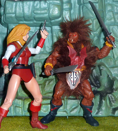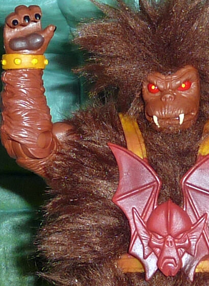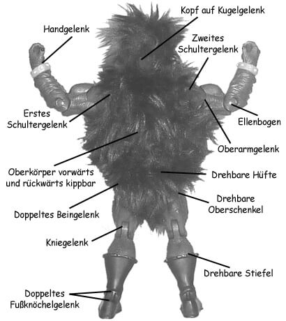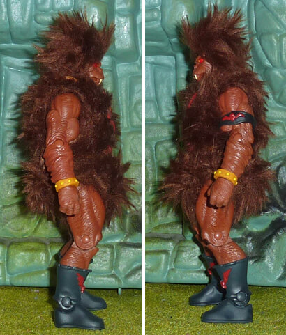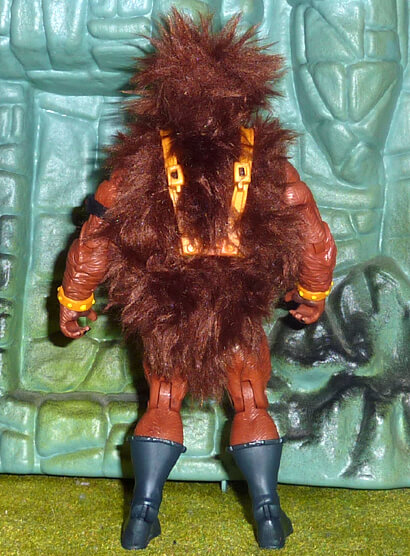 Man sollte auch versuchen, das Fell im Hüftbereich etwas nach oben zu ziehen, damit es an den Beinen nicht zu weit herab hängt. Dies wird vor allem durch den unter dem Fell liegenden Lendenschurz erschwert. Jawohl, Mattel hat die bekannte Fellhose sogar bei Grizzlor recycelt, was einerseits eine nette Obskurität ist, zum anderen aber reichlich unnötigt war und wie erwähnt den Fellbezug etwas zu weit nach unten zieht.