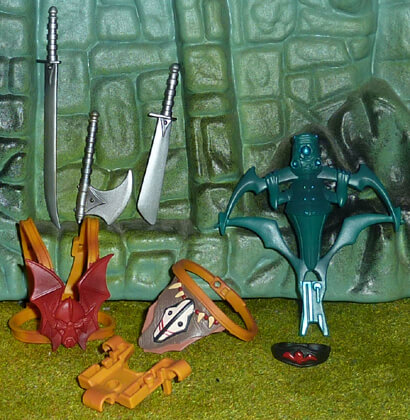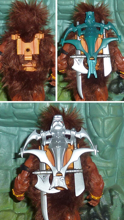 Grizzlors Mini-Statue entworfenen neuen Waffen übernommen. Zwar wurden die (hier ohnehin nutzlosen) Raketen und das Messer nicht umgesetzt, dafür aber Machete, Langschwert und Beil - mehr als genug für langweilige Nachmittage. Bekanntermaßen konnten bei Grizzlors Mini-Statue sämtliche Waffen außer der Armbrust an einem Rucksack befestigt werden. Auch dieses Konzept wurde hier adaptiert, wobei die abnehmbare Rüstung nun eine gelbfarbene Haltevorrichtung an der Rückseite aufweist. Dadurch können aber nicht nur die drei Schlagwaffen sondern auch die Armbrust problemlos befestigt werden. Damit nicht genug, können Vintage-Puristen sogar die Halterung selbst vom Rest der Rüstung entfernen.