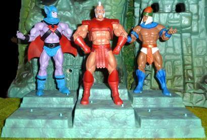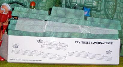 Farblich wird sich natürlich weiter an Grayskull orientiert, wobei die Schattierung nur leicht ist. Das macht sie letztlich nicht wirklich beeindruckend. Wie schon erwähnt befinden sich lediglich drei Platten im Set. Bei einem Preis von 15 Dollar plus Versand plus eventuelle Einfuhrumsatzsteuer klingt das nach einer kostspieligen Sache. Allerdings muß eingestanden werden, dass auf jeden Stand drei Figuren passen. Ein Set versorgt also insgesamt neun normalgroße Figuren, während die früheren Stands nur für jeweils fünf genutzt werden konnten. Allerdings gab es damals auch ein Mauerstück pro Stand dazu, das immerhin individuell angebracht werden konnte.
