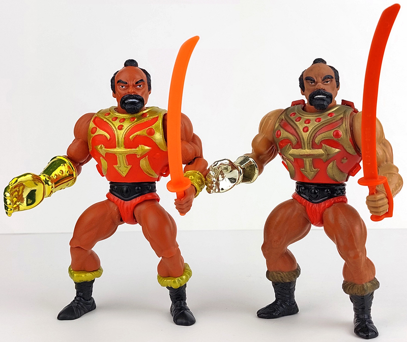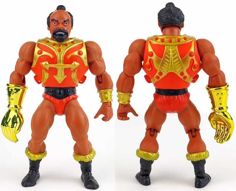 Die größtmögliche Ähnlichkeit zur Vintagefigur ist hier Programm. Jitsu ist folglich nahezu identisch mit Fisto. Einzig Kopf, Rüstung und rechte Hand sind natürlich neu. Wem Fistos Kopf etwas zu klein wirkte, der erhält bei Jitsu wieder größere Proportionen. Der Gesichtsausdruck wurde leicht modifiziert, um etwas weniger verzerrt zu wirken. So blickt Jitsu grundlegend wie früher, aber nicht mehr ganz so bösartig. In die Frisur wurde zudem ein Haarband eingearbeitet. Für Vintage-Puristen nicht störend, aber ein subtiles Detail.