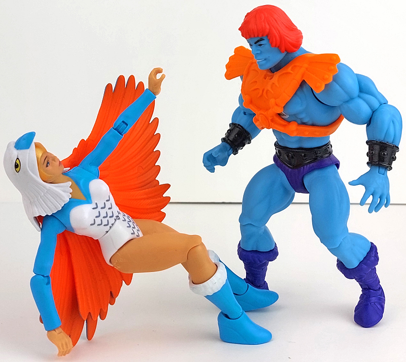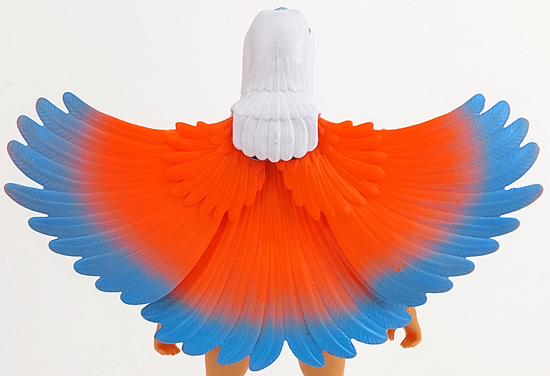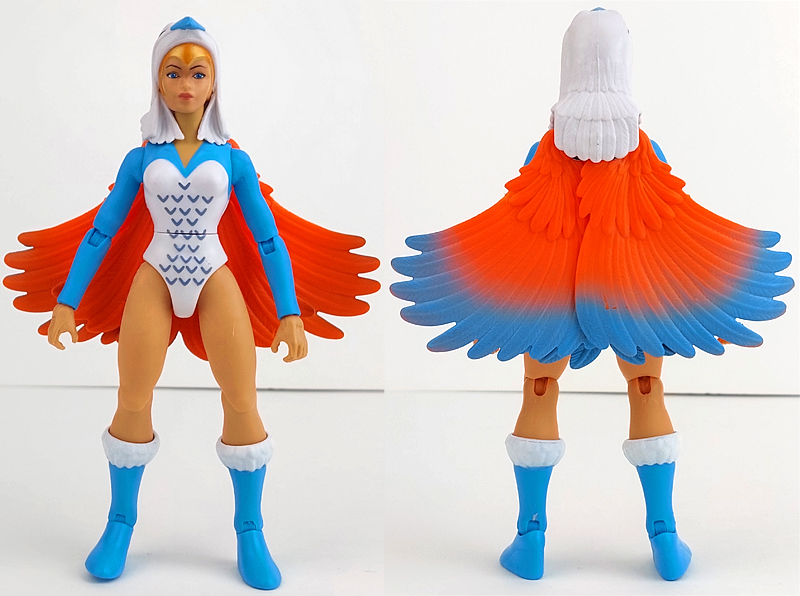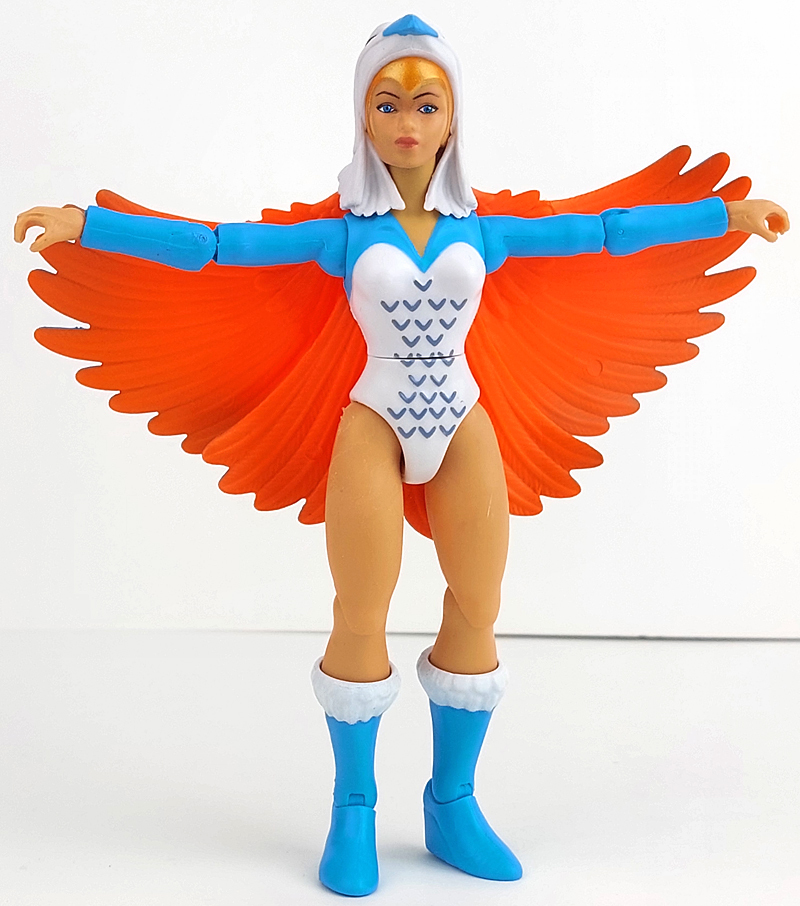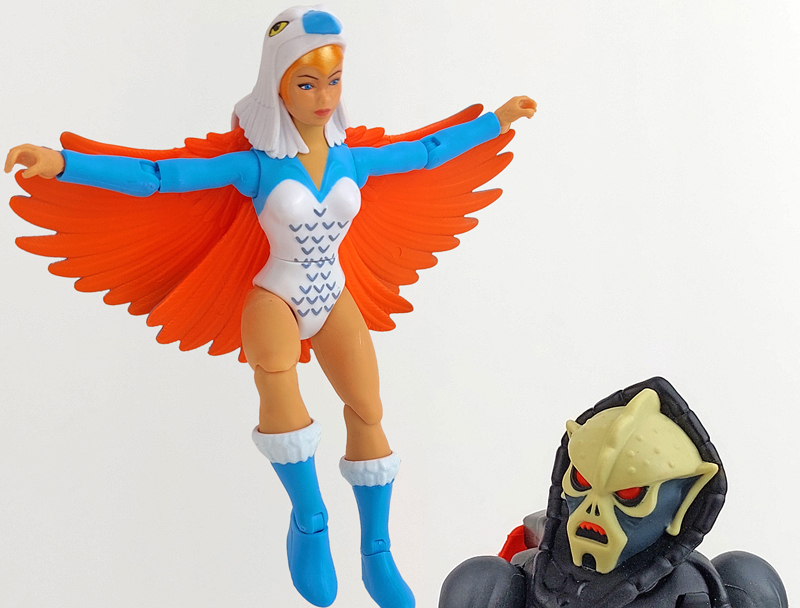 Somit sind die Flügel nicht wie ein Cape an den Armen befestigt, und die Kappe ist deutlich größer. Hier findet sich auch ein großes Manko. Denn zumindest beim vorliegenden Exemplar ist die Kappe leicht versetzt auf den Kopf geklebt. Das Problem von schiefen Helmen zieht sich leider schon seit Wave 1 durch diese und auch Mattels andere aktuellen Masters Toylines. Es wird also dringend Zeit, sich drum zu kümmern dass so etwas einfach nicht mehr passieren kann. Neu ist indes, dass die früher nur bemalten Federn auf dem Bauch nun auch modelliert sind.