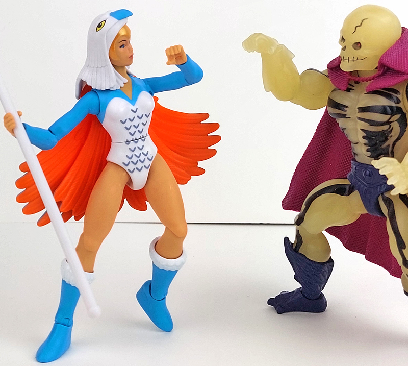 Wie schon erwähnt, sind die Flügel nicht wie im Cartoon als Federkleid mit den Armen befestigt, sondern gemäß der Vintagefigur aufklappbar gestaltet. Das einstige Actionfeature wird nun also gewissermaßen simuliert. Der große Vorteil ist natürlich, dass dadurch der Kopf separat gefertigt und beweglich ist. Natürlich wird dies durch die Kappe eingeschränkt. Aber es ist genug Spielraum vorhanden, um die Zauberin ein wenig seitlich blicken zu lassen.