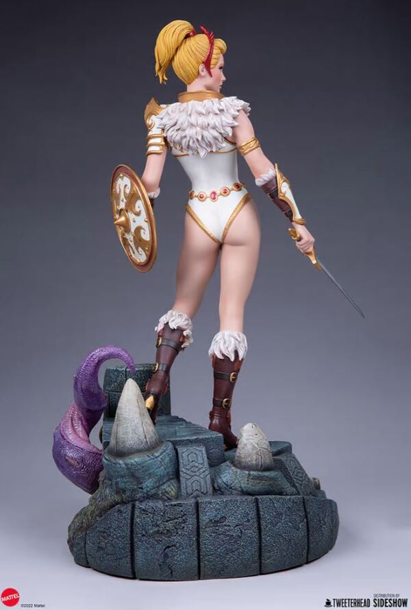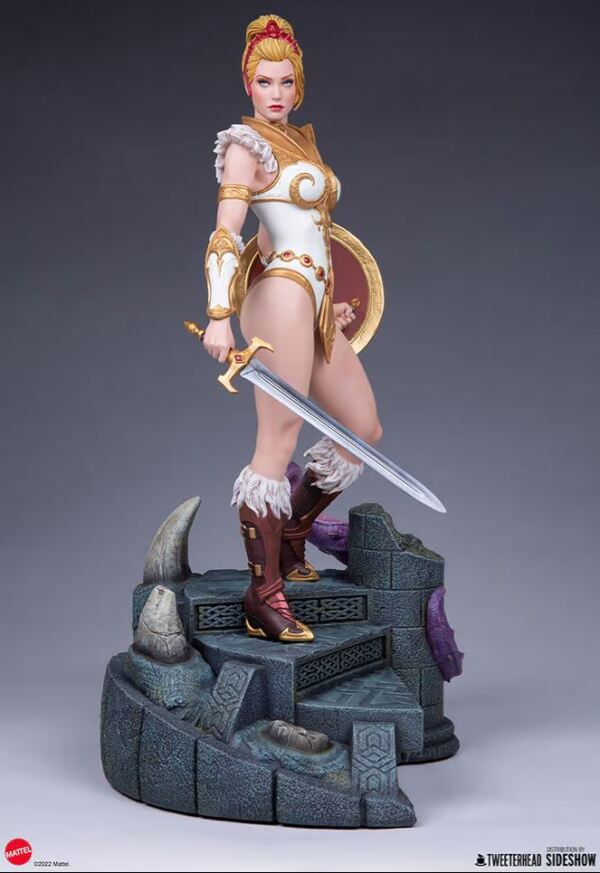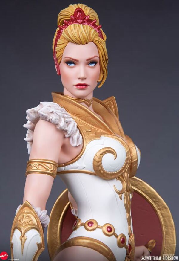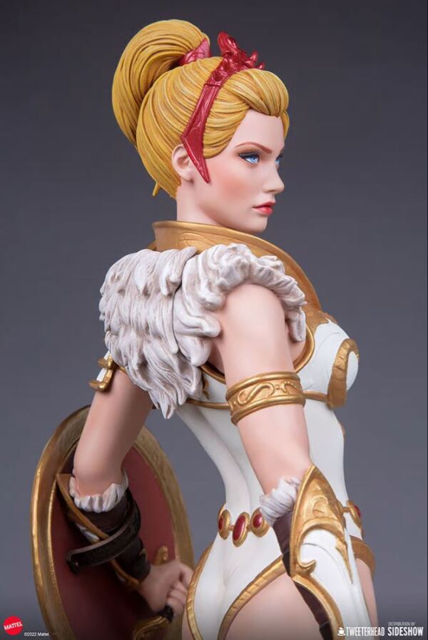 Ich habe mich eben extra noch einmal vergewissert: Die rote Tiara zu den blonden Haaren und auch der weiß-goldene Schild sind eindeutige und auch sehr treffende Reminiszenzen an Teelas Auftritt im allerersten Motu Minicomic "He-Man an the Power Sword". So gesehen passt das schon sehr gut.