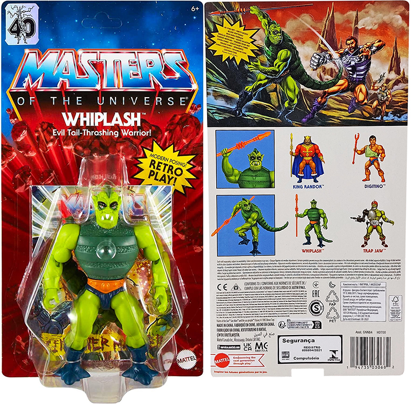Whiplash ist so verpackt worden, dass das untere Schwanzsegment hinter der Figur drapiert ist und auch die Waffe großteils überdeckt. Sieht nicht unbedingt ideal aus, wirkt aber auch nicht allzu störend. Der Zusammenbau nach dem Auspacken ist sehr einfach, allerdings sollte nicht versucht werden, den Schwanz wieder zu lösen. Das Cardback-Motiv ist eine schöne "Vorgeschichte" des Artworks der Vintagefigur. Während Whiplashs Pose nahezu identisch ist, kämpft er gerade noch gegen Fisto, während sich Battle Armor He-Man erst nähert.