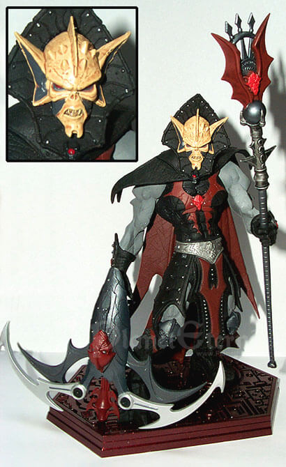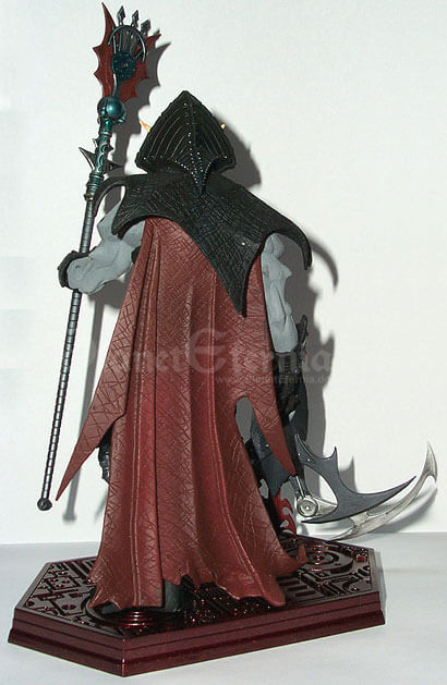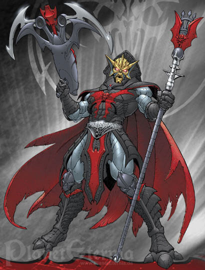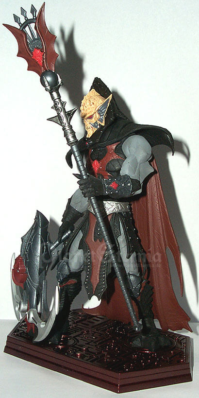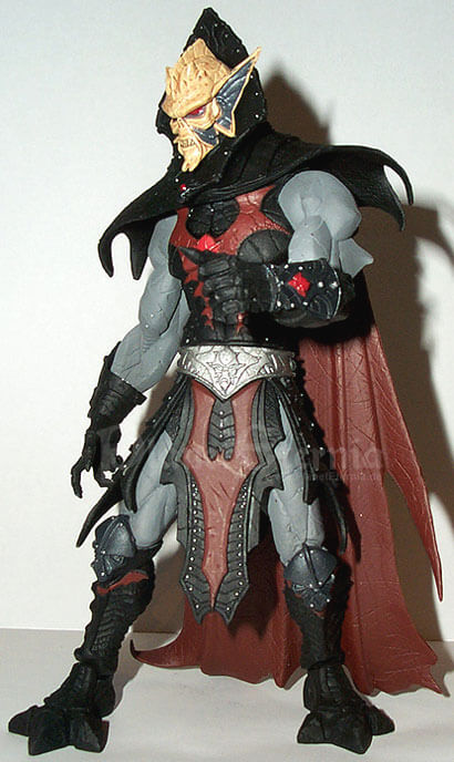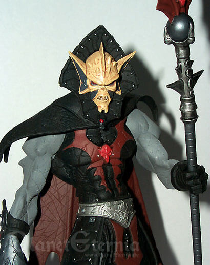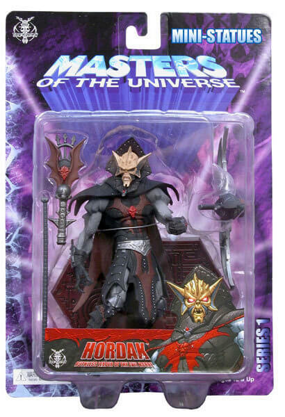 Hordak selbst bietet eine äußerst imposante Erscheinung, nicht zuletzt da er die normale He-Man Figur beinahe um einen ganzen Kopf überragt. Dieses Größenverhältnis stiess bei vielen Fans anfänglich auf Unverständnis, wurde von den Four Horsemen jedoch damit begründet, dass He-Man starke Gegner brauche. Daher war auch Skeletor ursprünglich etwas größer konzipiert gewesen und sollte seinerseits ebenfalls von seinem ehemaligen Lehrmeister überragt werden. Dennoch wirkt He-Man im direkten Verhältnis beinahe schon zu schmächtig gegen den Anführer der Wilden Horde. Natürlich basiert auch Hordak?s Design wieder klar auf der Classic-Figur, welche konsequent modernisiert und weiter entwickelt wurde. Dementsprechend werden jene, welche den klassischen Cartoon-Hordak bevorzugen, hier kaum Ähnlichkeiten finden, Liebhaber des Spielzeugs dafür umso mehr. Der Herr der Wilden Horde präsentiert sich nun mit einem wahrhaft bösartigen Gesichtsausdruck, der nahezu jeden bis dato erschienenen 200x-Schurken schon beinahe harmlos aussehen lässt. Interessant sind besonders die grauen Partien an Armen und Beinen, die nun nicht mehr wie Haut sondern ebenfalls Teil einer Rüstung aussehen. Der Hordak?s Hinterkopf verdeckende Kragen nun weitaus glaubwürdiger, während das Cape einen zerfetzten Eindruck macht und nahezu bis zum Boden reicht. Insgesamt strotzt die Mini-Statue dabei vor unzähligen Details, was von den gefletschten Zähnen über die Lederkontur des Capes bis zu zahlreichen kleinen Hordak-Emblemen reicht. Auch hier können die Action-Figuren im Direktvergleich kaum mithalten, was auch auf die Bemalung zutrifft. Hier wurde ebenfalls größter Wert auf Detailreichtum gelenkt, wodurch sogar kleinste Nieten in der schwarzen Rüstung silbern gefärbt wurden. Dabei sind die Farben auch noch sehr exakt aufgetragen worden, wodurch grobe Ungenauigkeiten wie man sie von der "Massenware Actionfigur" her kennt, nahezu ausgeschlossen sind! Während sämtliche Farben deutlich an die Bemalung aus den 80er Jahren angelegt ist, fällt lediglich auf dass die vormals roten Zähne hier weiß sind, was aber keineswegs schlecht aussieht.