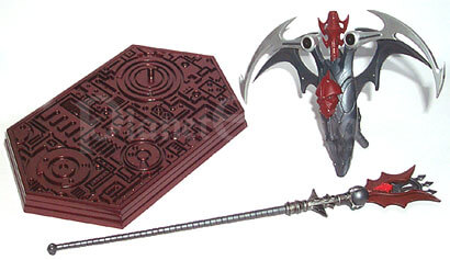 Das Zubehör liegt seinerseits der Mini-Statue separat bei. Allem voran wurde für die Reihe extra ein Standpodest angefertigt, auf dem die Stactions sicheren Stand finden. Das Design scheint hierbei eine Art Metallplatte darzustellen, die neben der interessanten Gestaltung insbesondere den Vorteil hat, dass sie zu jedem Charakter passt, wodurch für jede Statue die gleiche Form genommen werden kann (was wiederum Kosten einspart). Für jede "Fraktion" wie Helden, Schurken etc. wählten die Horsemen eine andere Farbgebung; im Fall der Horde wurde sie passenderweise metallic-rot bestrichen. Zusätzlich liegen Hordak noch eine große Armbrust sowie ein äußerst langer Stab bei. Letzteres setzt sich aus zwei Partien zusammen, die durch einen kleinen Haltestift nahtlos verbunden werden. Auf diese Weise ist es problemlos möglich, den Stab in die enge Öffnung der linken Hand zu schieben. Allerdings sollte man beide Teile vorsichtig zusammen stecken, da der kleine Haltestift ansonsten leicht abbrechen kann. Auch diese beiden Waffen wurden mit reichlicher Liebe zum Detail gestaltet.
